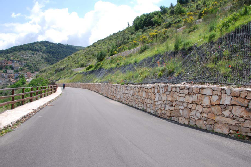 Rete paramassi e muratura in pietra calcarea a facciavista poste a protezione della strada - 01/09/2008